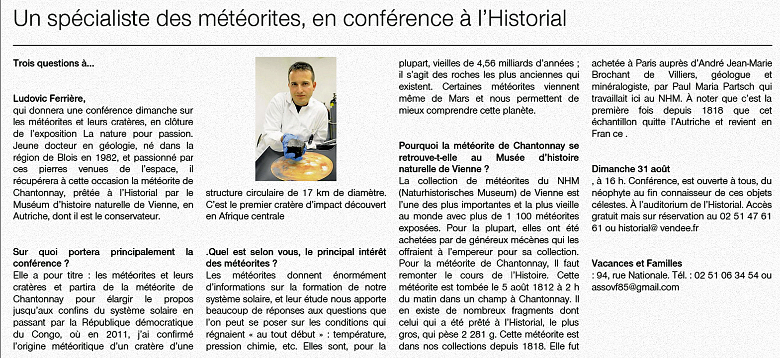 « Tous les Évènements Cet évènement est passé. Conférence sur les météorites à l’Historial 31 août 2014 @ 16 h 00 min - 18 h 00 min « Sortie en Charente maritime – L’Île Madame et Port-des-Barques Week-end géologique dans le Pays du Léon (Finistère) » Ajouter au calendrier Google Agenda iCalendar Outlook 365 Outlook Live Détails Date : 31 août 2014 Heure : 16 h 00 min - 18 h 00 min Lieu L’Historial Les Lucs-sur-Boulogne, 85 France + Google Map