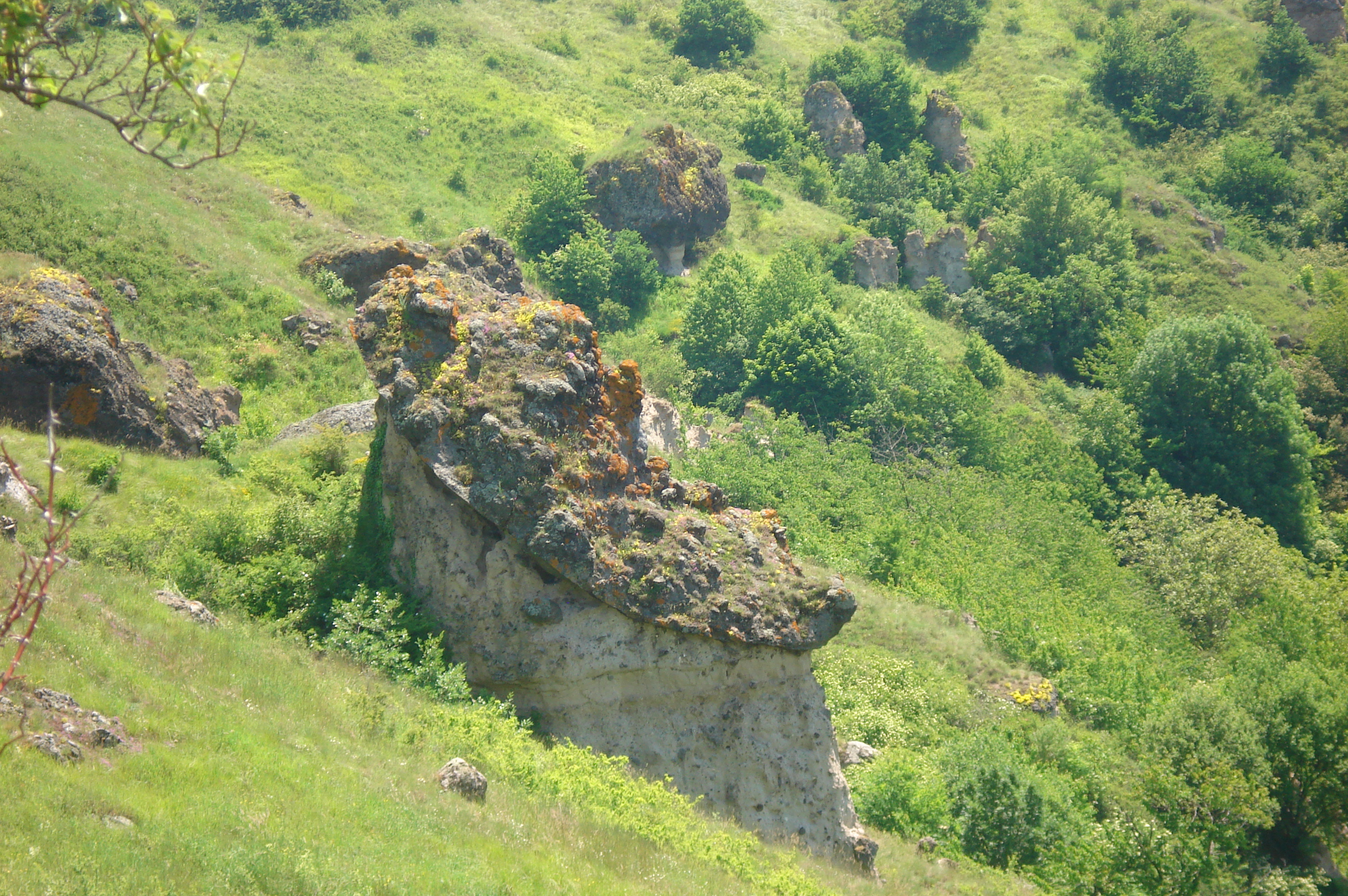DSC08881 25 mars 2015Pleine résolution (2816 × 1872) ← Précédent Suivant → « Le Bolet » avec lahar inférieur / niveau-repère sableux / lahar supérieur avec un gros bloc cyclopéen formant le chapeau – Le Perrier (63)