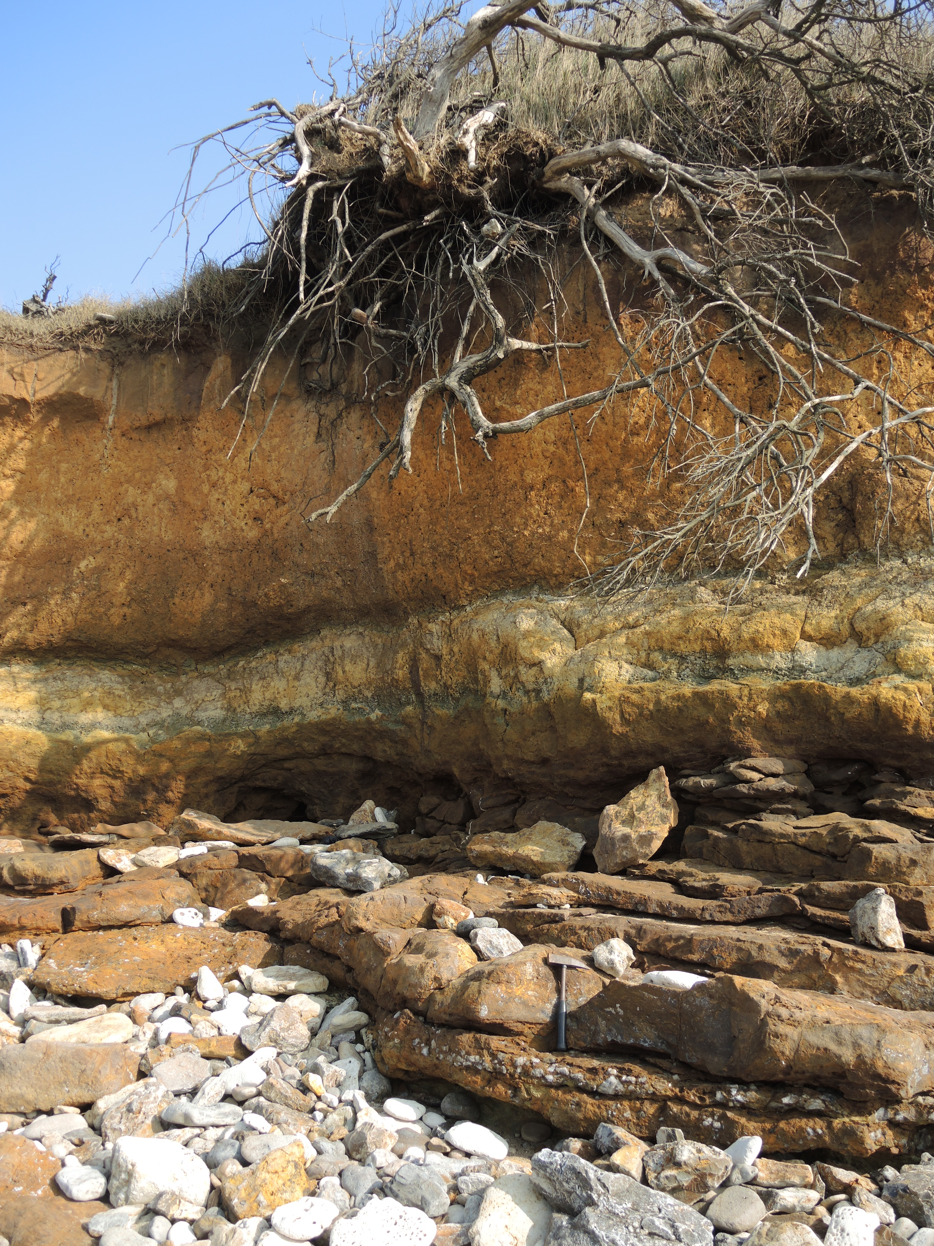 Détail de la discordance – Noter le niveau conglomératique de base dit « Nougat » sous le manche du marteau et les deux niveaux d’argile verte du Lias sous les branches les plus basses.