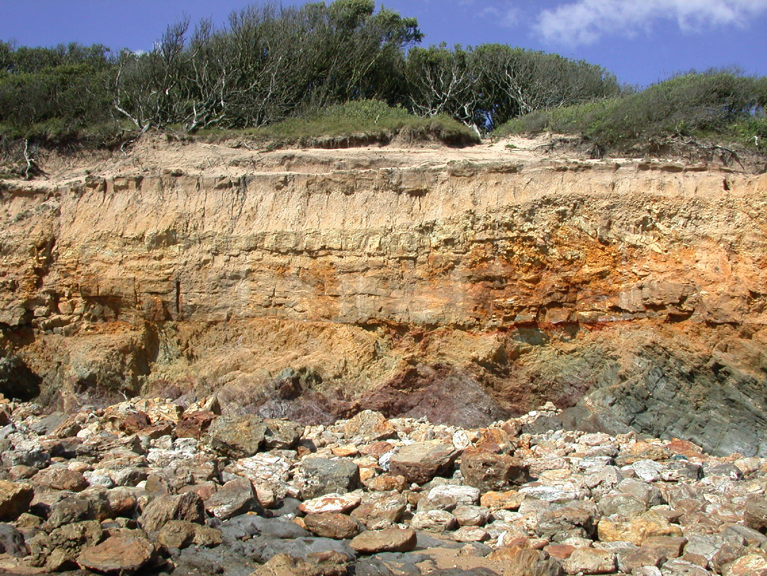 Falaise de l’Anse Saint Nicolas de Jard-sur-Mer – Détail de la discordance – Le socle gris-rouge est visible en bas de falaise.